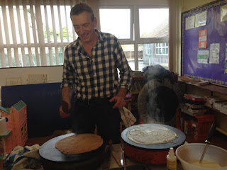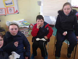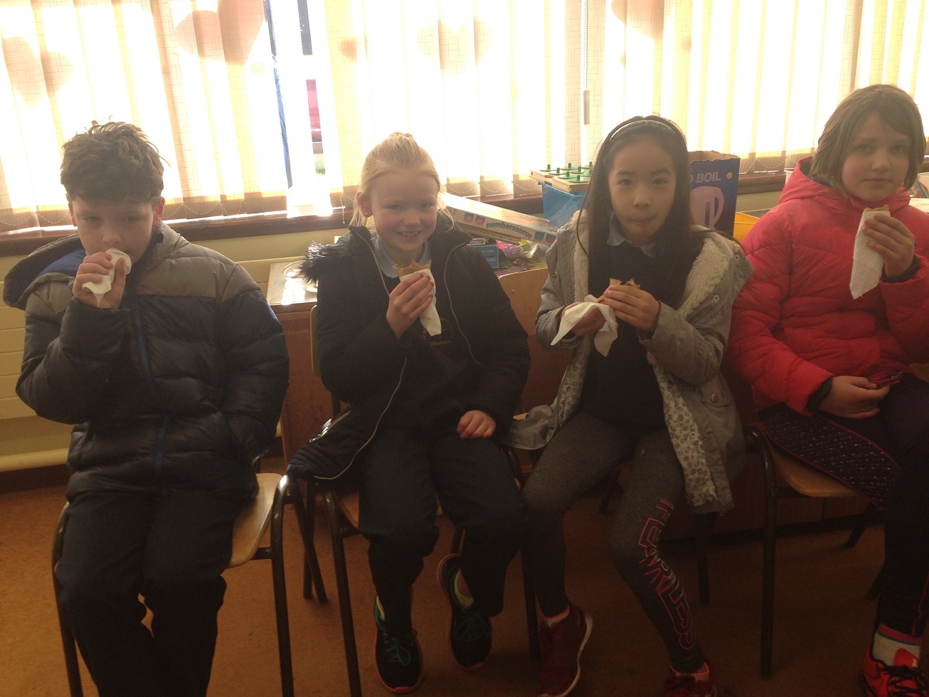 On Shrove Tuesday Pascale made delicious crêpes for everyone in school. Here are 4th class enjoying theirs. Yum!