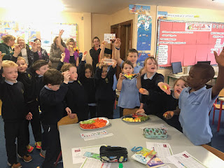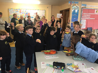 Michelle Fanning came to our school on Friday the 13th of October and did a Play Workshop with the first class children and their parents. Super Valu also came in to promote healthy eating and brought in exotic fruit and vegetables for the children. The children got to sample some fruits and vegetables after the workshop.